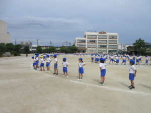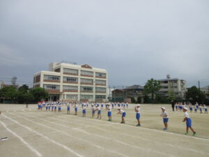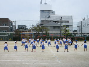 1,2年生合同で、競争遊戯の練習に取り組んでいます。