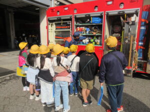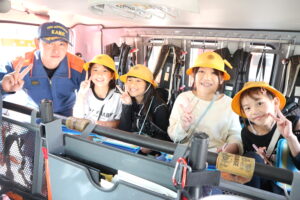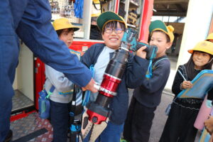 消防車やはしご車、タンク車、救急車を見せてもらったり、ホースや救助のための道具を触らせてもらったりして、子どもたちは興味津々でした。