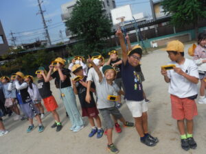 理科の「太陽とかげ」の学習で遮光プレートや温度計などを使って、さまざまな観察をしました。