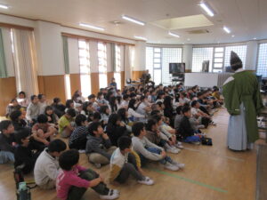 4年生では、地域に伝わる伝統的なものについて社会科で学習をしてきました。そこに関連して、スクールサポーターとして本校に勤務していただいている加藤善光さんをお招きして蟹江町に伝わるお祭りや地域の歴史について詳しく教えていただきました。子どもたちは、蟹江祭りが400年前から続いていることに驚き、自分が参加したお祭りの記憶をたどりながら、自分事として興味を持って話を聞いていました。また、伝統的な雅楽を実際に演奏していただき、お祭りの厳粛な雰囲気も感じていました。伝統的なお祭りを伝えていくことの大切さを知るとともに、続けていく難しさも学びました。
