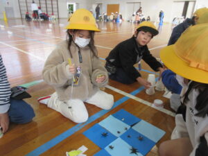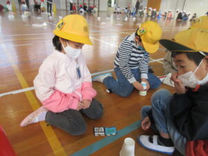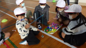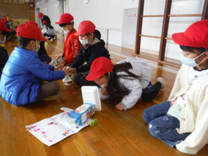 2年生が工夫して作ったおもちゃで遊ばしてもらい、1年生は終始ニコニコ。