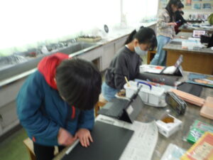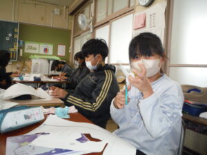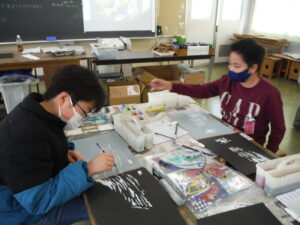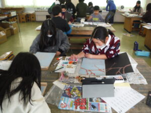 図画工作では、多色刷り版画を行っています。それぞれが、選んだ浮世絵をもとに色の重ね方を工夫していました。