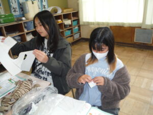 算数では、角柱や円柱を実際に作り、底面や側面の形や数を確認しました。実際に作ってみると、新しい発見がありますね。