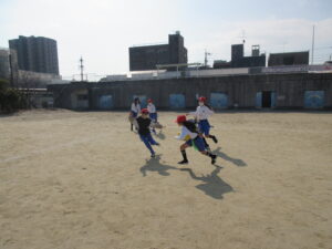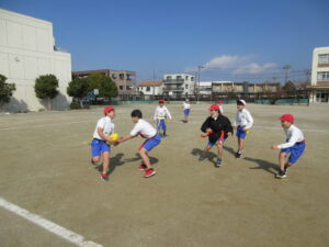 体育では、タグラグビーを行っています。機敏に動く姿があり、見ごたえのある姿でした。