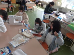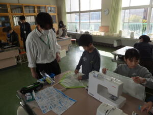 家庭科のエプロン作成時に、保護者のボランティアの方と、大学生のボランティアの方に手伝っていただきました。